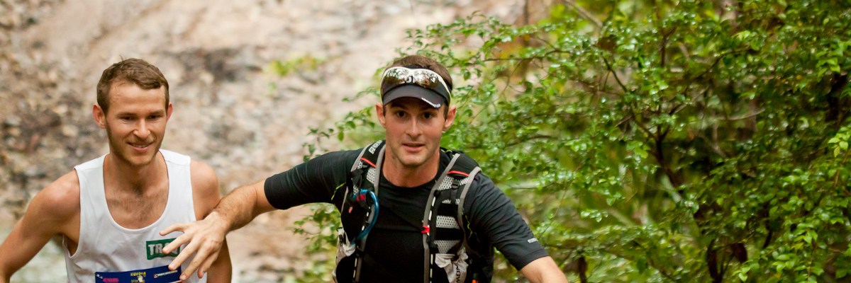 10 minutes before the start of the race I had my breakfast of a hammer gel (raspberry – yum) washed down with water and next thing I knew we were all off on our way. Caine let off the start line, and it was definitely a good thing that I hung back behind him given I didn’t even know if the first turn at the trail-head was a right or a left (for those who haven’t run the course but want to in the future: it is a right!). Within a few hundred meters we hit slippery mud and tentatively negotiated the slop. Given this was pretty all that I had seen of the trail, I was beginning to wonder if the entire 50km would be as muddy (was it going to be like Kokoda Challenge 2012 all over again?). I was actually really impressed at how well my Hoka Bondi B’s handled the slippery conditions but still had my fingers crossed that the mud wouldn’t last. Fortunately it didn’t take too long for ground underfoot to solidify and Caine and I quickly fell into a rhythm (at this stage Dave and Dan were holding back a bit).